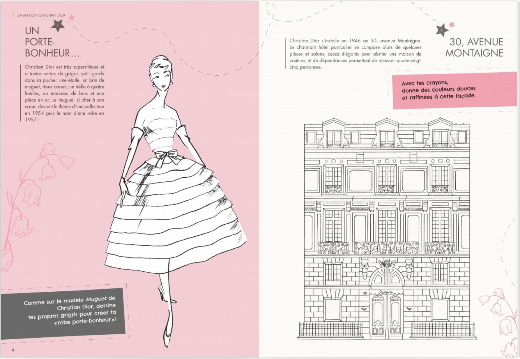 42 ページにわたって、クリスチャン・ディオールの素晴らしい世界を、描いたり、塗り絵したり、コラージュしたり。